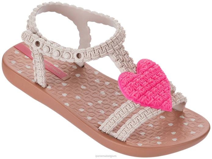 de perfecte starterssandaal voor je kleintje, met crèmekleurige bandjes met een gehaakt ontwerp, mooie felroze hartjesversiering en een sierlijke print op het lichtbruine voetbed. Deze sandaal heeft een verstelbare riem met drukknopen die ervoor zorgt dat hij goed op de voet blijft zitten. perfect voor dagelijks gebruik.